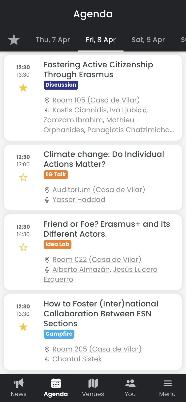 The Erasmus Generation Meeting also included several other moments and celebrations, like a captivating flag parade, a gala dinner and more. Therefore, we added a fully-navigable map to help the participants reach the correct venues. Finally, the app contained a news area to keep the participants up to date with critical communications, tips and helpful information.