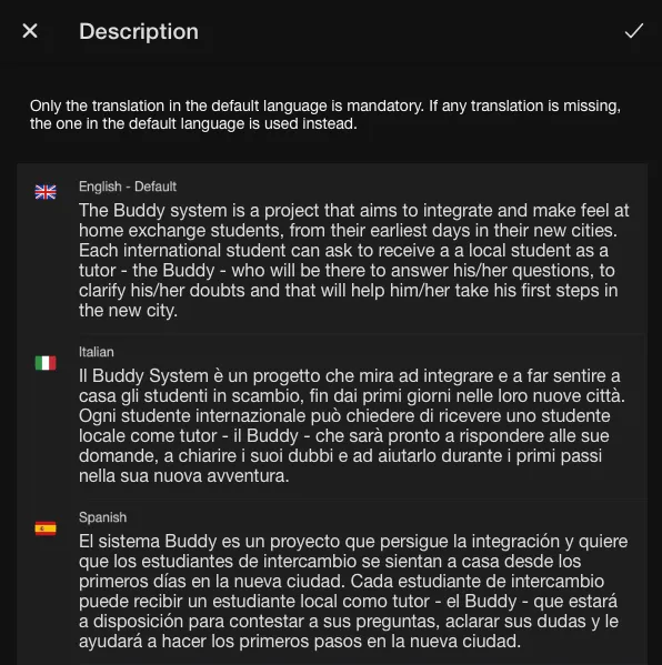 When we create a new project – from scratch or using one of the templates from the Gallery, we can now edit all the related information. Since we are in such an international environment, Papaya supports full multilingual capabilities.