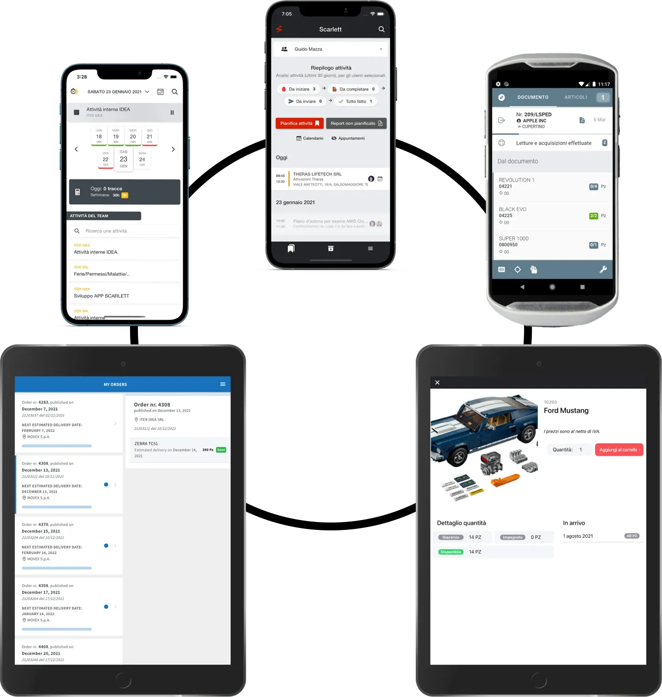 In questo schema riportiamo un ecosistema di applicazioni ITER IDEA progettate per digitalizzare processi aziendali: dalla ricezione degli ordini B2B ai flussi di magazzino, dagli aggiornamenti sullo stato delle spedizioni verso i clienti finali alla digitalizzazione delle operazioni di post vendita, con imputazione dei costi sulle relative commesse e centri di costo.