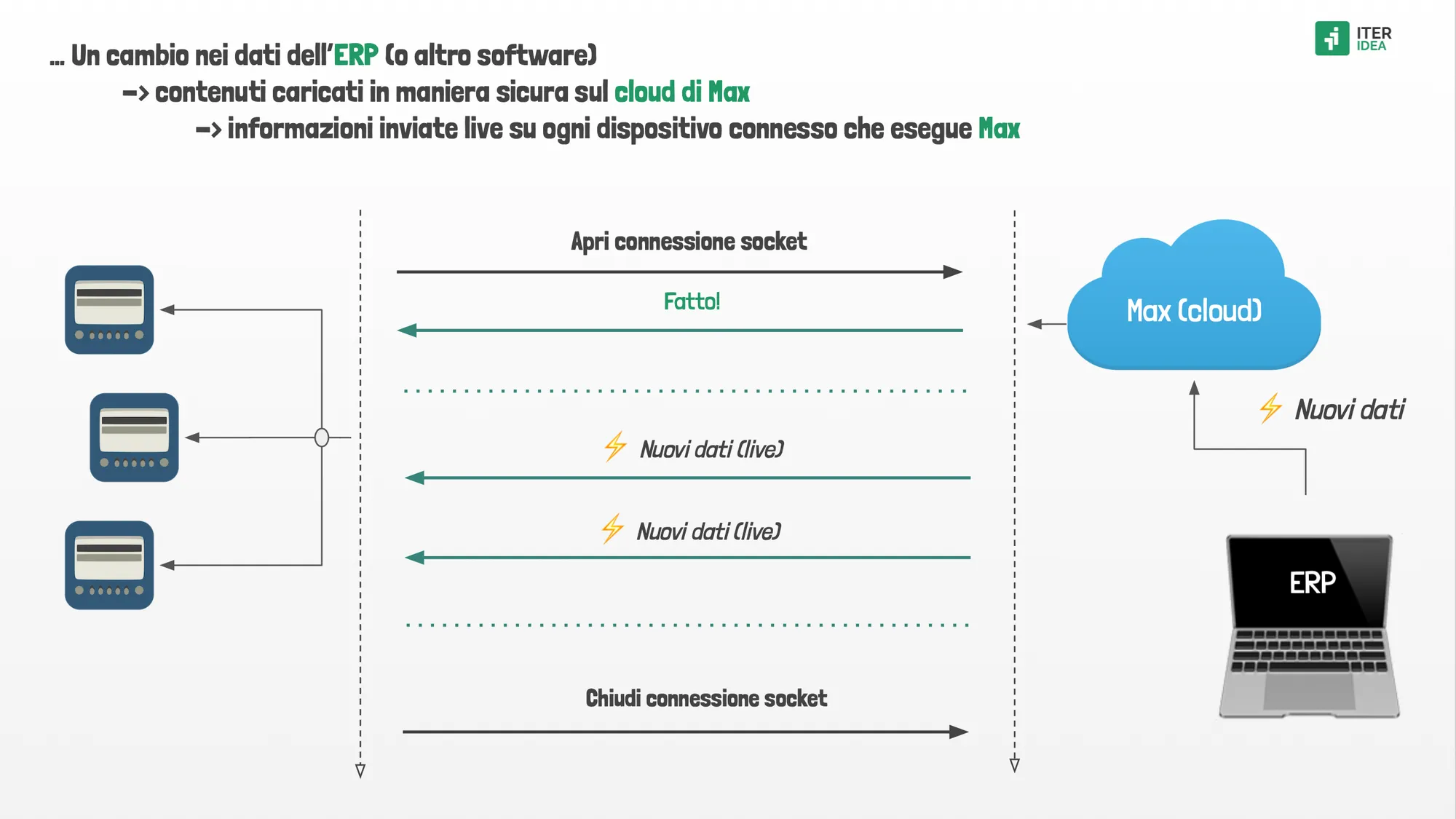 Nel nuovo modello, quando un dato viene modificato nell’ERP (o altro software) e inviato al cloud di Max, le informazioni generate vengono automaticamente distribuite, in tempo reale, a qualsiasi dispositivo che esegue l’app, attraverso una connessione socket sicura.