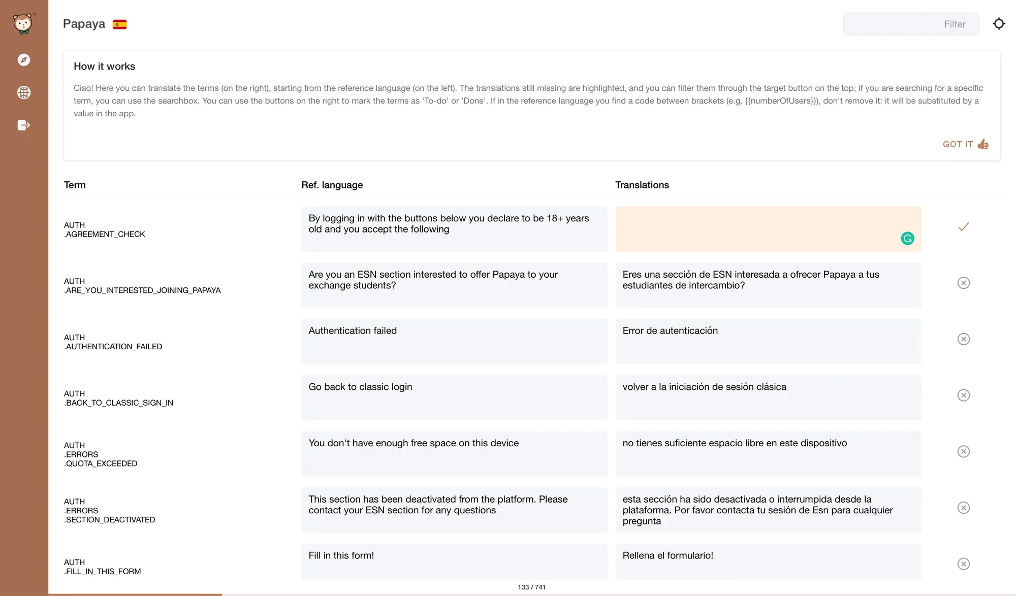 On the left the original sentences, on the right the areas to translate. Easy peasy.