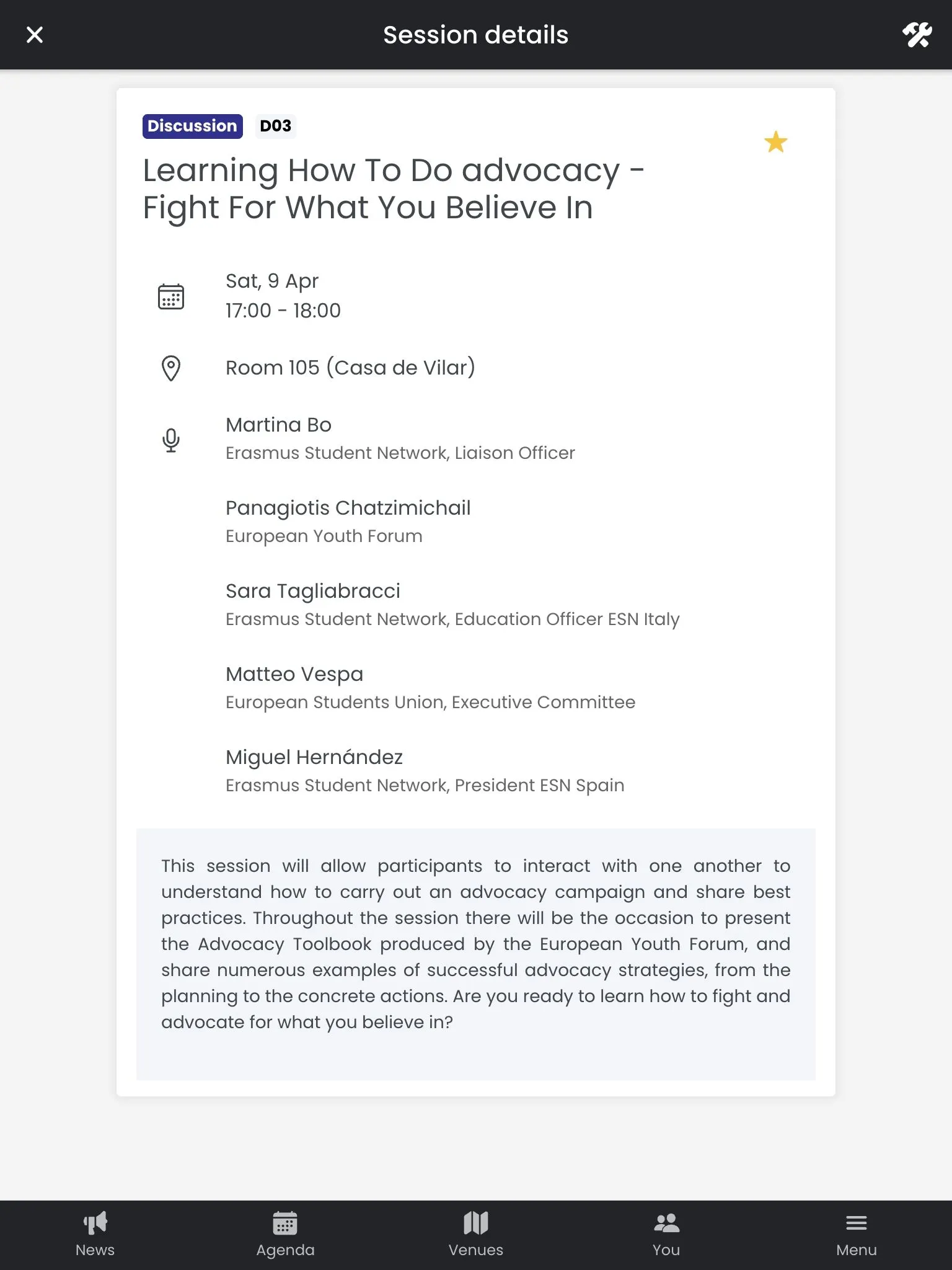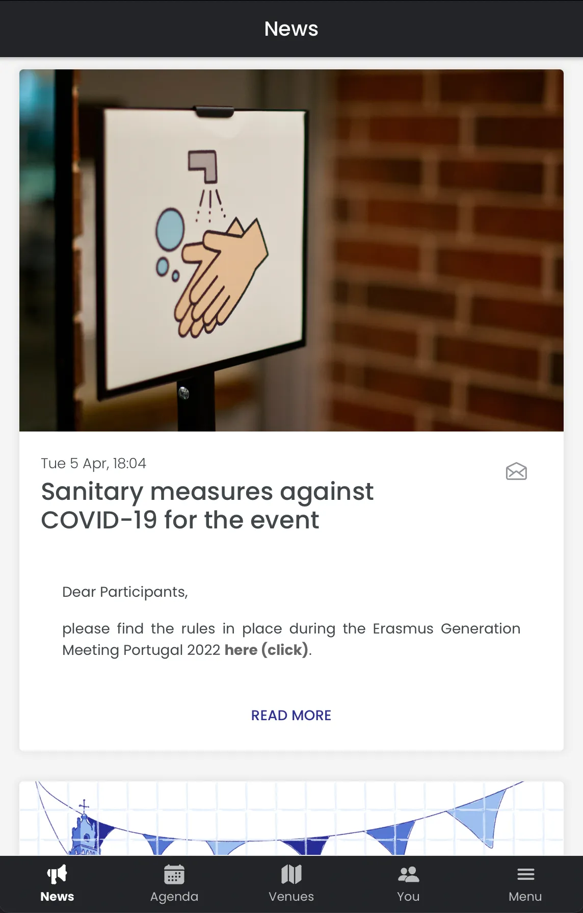 The Erasmus Generation Meeting also included several other moments and celebrations, like a captivating flag parade, a gala dinner and more. Therefore, we added a fully-navigable map to help the participants reach the correct venues. Finally, the app contained a news area to keep the participants up to date with critical communications, tips and helpful information.