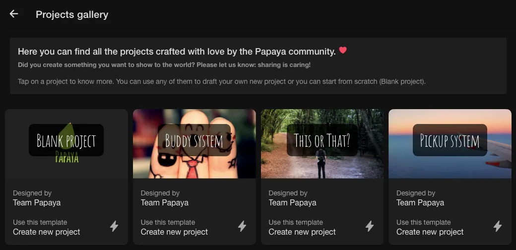 A glance at the new Projects Gallery of Papaya – in a beautiful dark mode.c