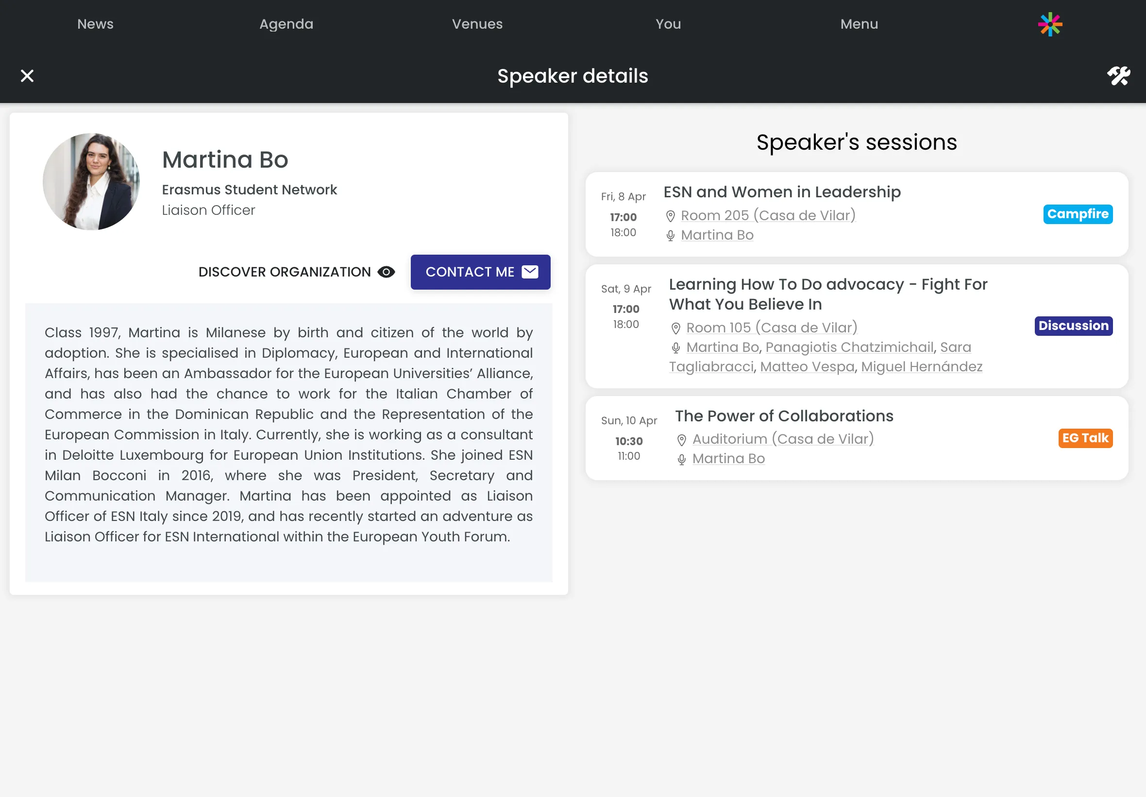 Tra le altre caratteristiche, l’app ha permesso ai partecipanti di scoprire e conoscere le organizzazioni e gli speaker coinvolti nell’evento, lasciando loro la possibilità di entrare in contatto attraverso diverse call-to-action.